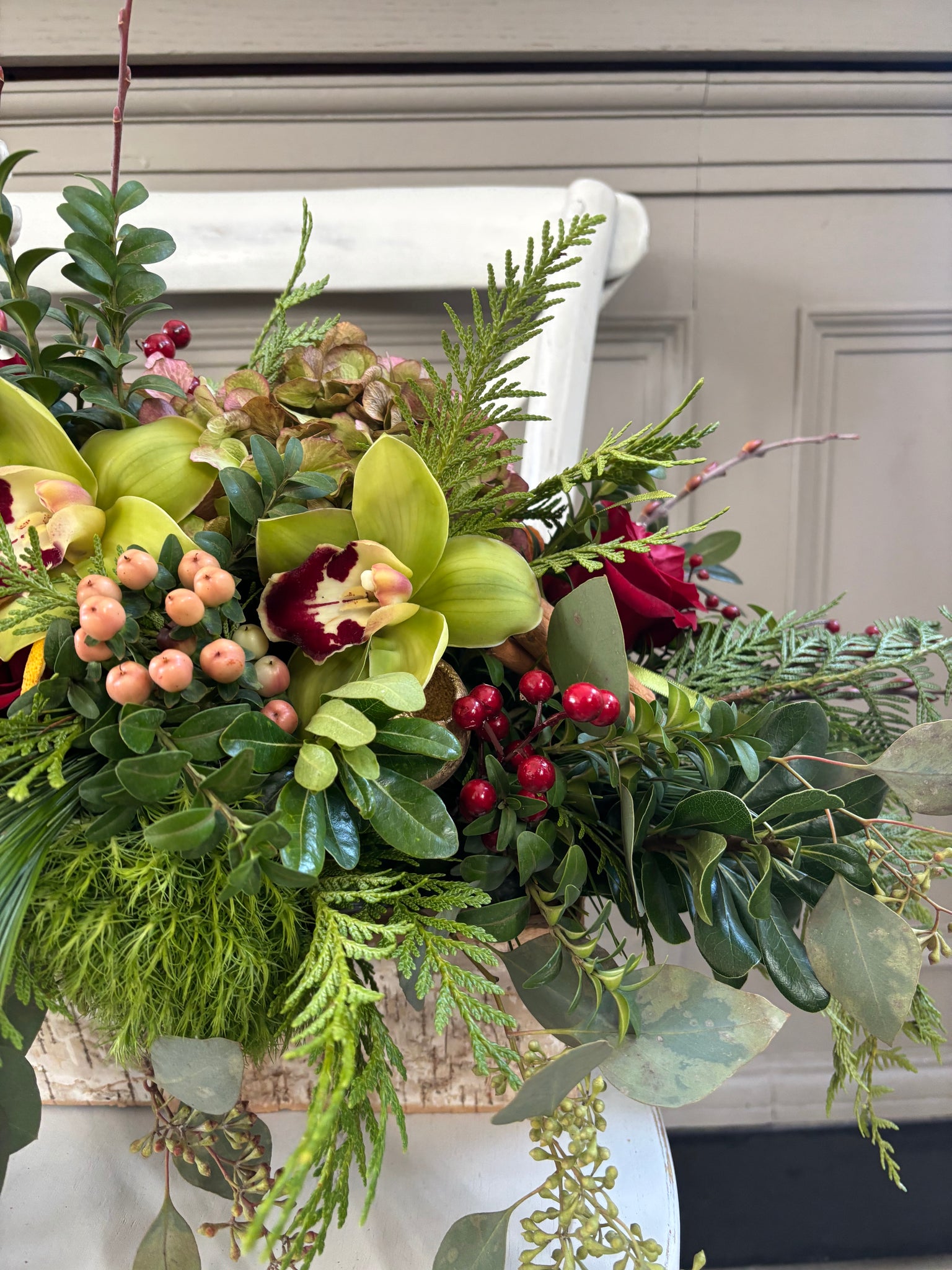 A traditional long and low centrepiece in warm holiday tones of reds, burgundy and greens. Classic winter foliage with red roses, green hydrangea, cymbidium orchids, berries, pine cones and dried elements. Designed to be perfectly placed along the centre of a full holiday table. Final design will be created as similarly based on market availability and designer selections.